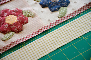 Next, I stitched the flower section to the picket fence section and voila! That teeny, tiny little strip adds so much to the look that I'm trying to achieve with this quilt. It would be so much plainer without it.
