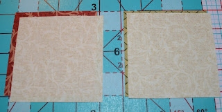First cut (16) squares from the maroon. Refer to page #13 for cutting directions. Mark a line from corner to corner on each square, then pin to the block.