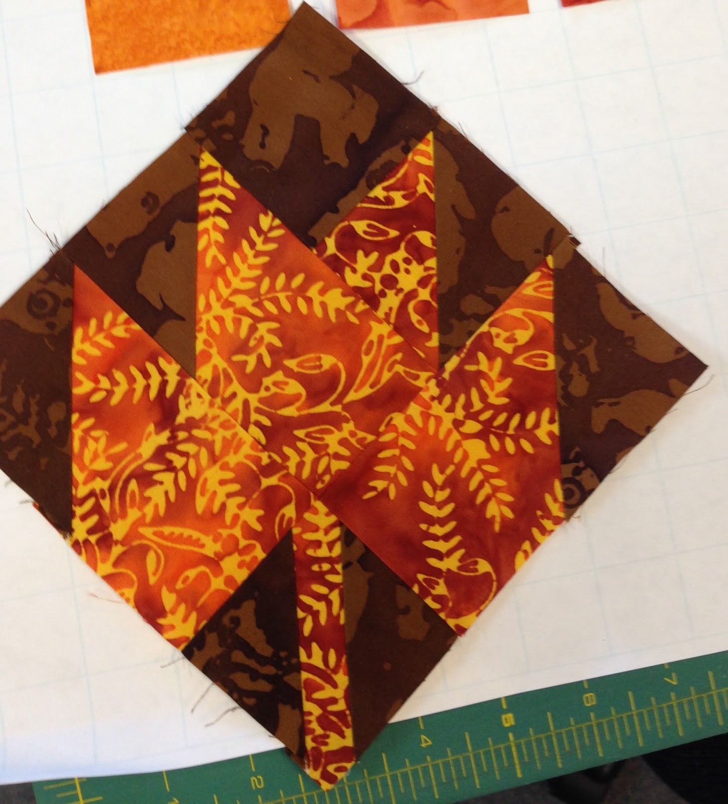 The class began the process of making Scrappy Leaves......and it is a process. Scrappy Leaves was designed by Ilene Bartos and is in her Maple Leaf Quilts book.